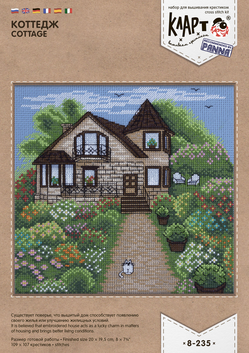В набор для вышивания " Кларт" входит: канва аппретированная " Gamma" К04, хлопчатобумажные нитки мулине " Gamma" на держателе, специализированная игла с тупым концом " Gamma" для вышивания, подробная инструкция по вышиванию и схема. Существует поверье, что вышитый дом способствует появлению своего жилья или улучшению жилищных условий.